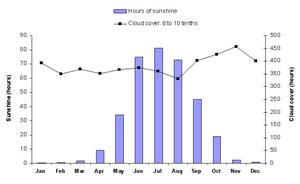 In Fort McMurray, mean hours of sunshine are highest in summer, when day length is longest and heavy cloud cover (80% to 100% of the sky) is relatively infrequent (see the top graph to the right). Cloud cover is highest during fall and winter (September to January); hours of sunshine as a percentage of possible daylight hours is thus lowest during these months (see the bottom graph to the right).